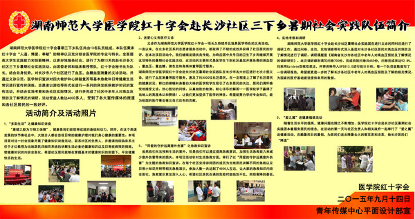 今年7月,我校医学院教授于才红带领红会“三下乡”队13名成员到藕塘村进行社会实践活动。在实践过程中,于才红向村民传播饮食营养健康知识,与百余名村民进行交流,带领实践队设置义诊台。岳麓区政协认为,在村民老龄化严重、老年病普遍的藕塘村,我校医学院学子的举动是区校共建大学生道德高地的生动体现。