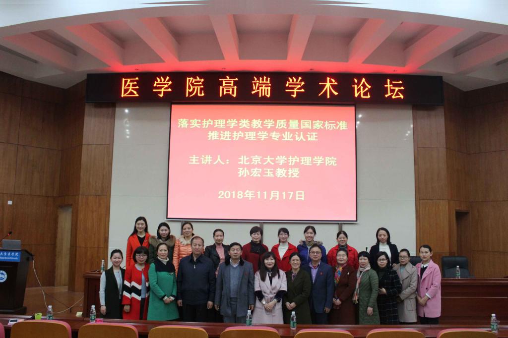 2018年11月17日下午,北京大学护理学院教授、教育部高等学校护理学专业教学指导委员会秘书长孙宏玉教授和天津医科大学护理学院院长、教育部研究生教育护理学专业学位教学指导委员会召集人、教育部高等学校护理学教学指导委员会委员赵岳教授应邀参加医学院高端学术论坛,在学术报告厅进行了两场精彩的主题学术讲座。讲座由贺权源教授主持,医学院何祖平院长致欢迎辞。