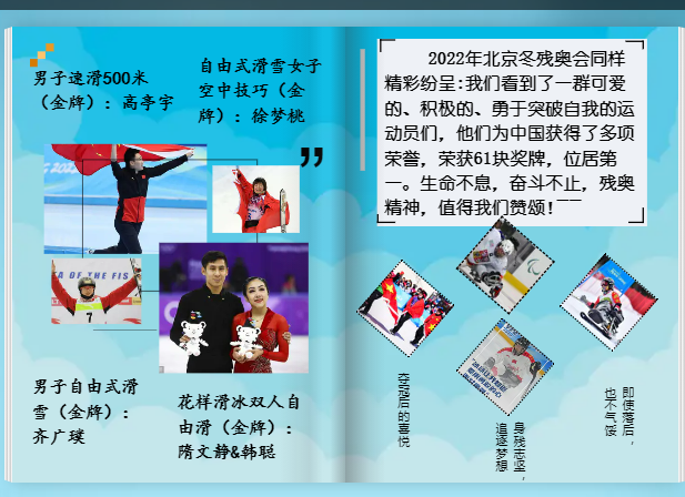 冬奥会上中国运动健儿们拼搏奋斗,不断挑战、超越自我,最终为祖国夺得了多项荣誉,为他们点赞!身残志坚、突破自我的残奥精神同样值得我们赞颂。
