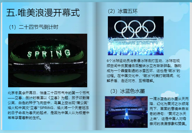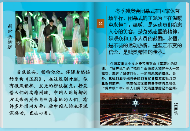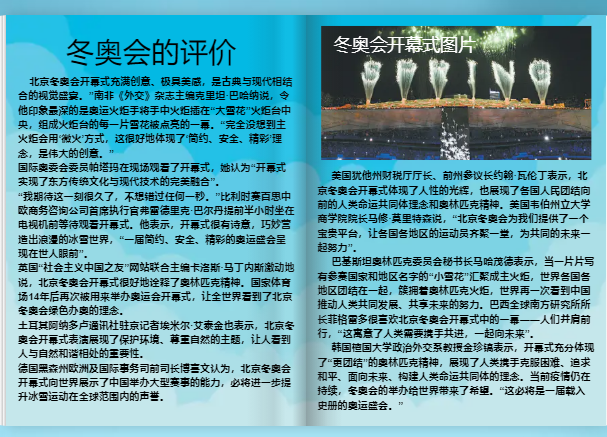 冰天雪地、春风送暖,两场奥运盛会进展如火如荼。本期杂志我们将向大家介绍冬奥会和冬残奥会相关的赛事场地、竞赛项目、别开生面的开闭幕式、奥运小故事以及影响评价等等,现在,就让我们一起来看看吧!
