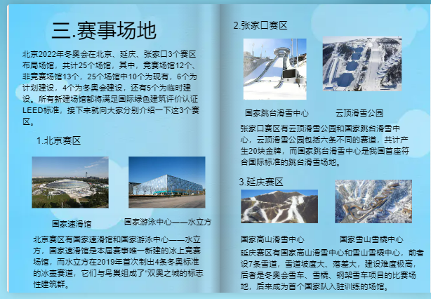 在北京、延庆、张家口3个比赛场地我们领略到了北国壮丽的冰雪风光,也感叹于独特的标志性建筑,就让我们一起来期待在这些比赛场地上将会捕捉到哪些精彩瞬间吧!
