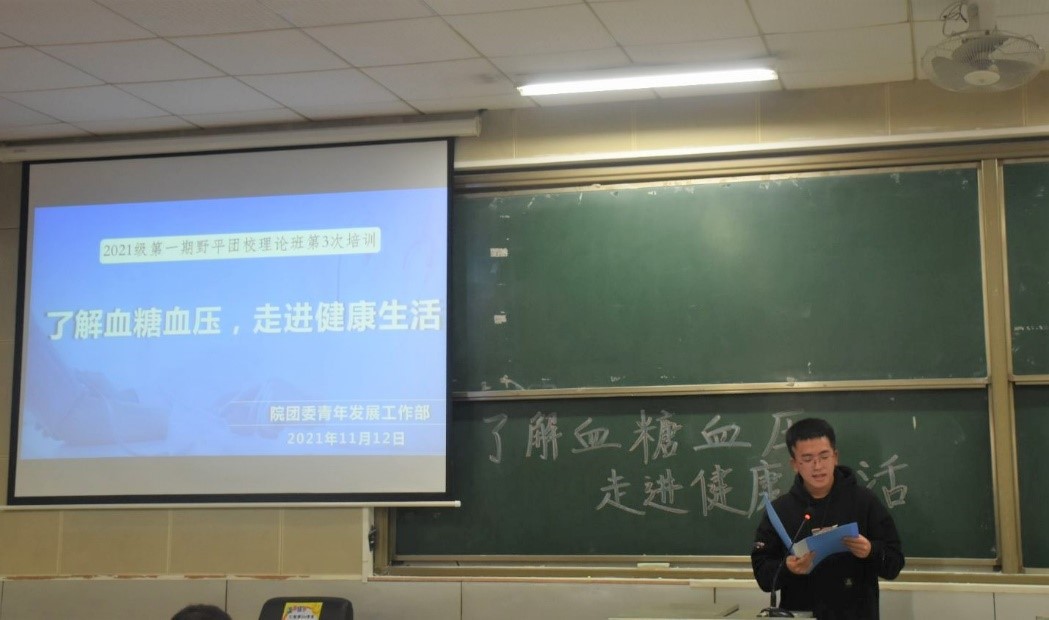 11月12日中午,由我院团委青年发展工作部组织的“了解血糖血压,走进健康生活”主题团课于仁医楼南栋306教室顺利开展。此次活动由健康资讯队成员20级临床一班朱鑫平、20级临床二班罗牡群、20级临床二班周凯进行主讲,21级预防班吴磊主持。理论班全体学员参与此次讲座。