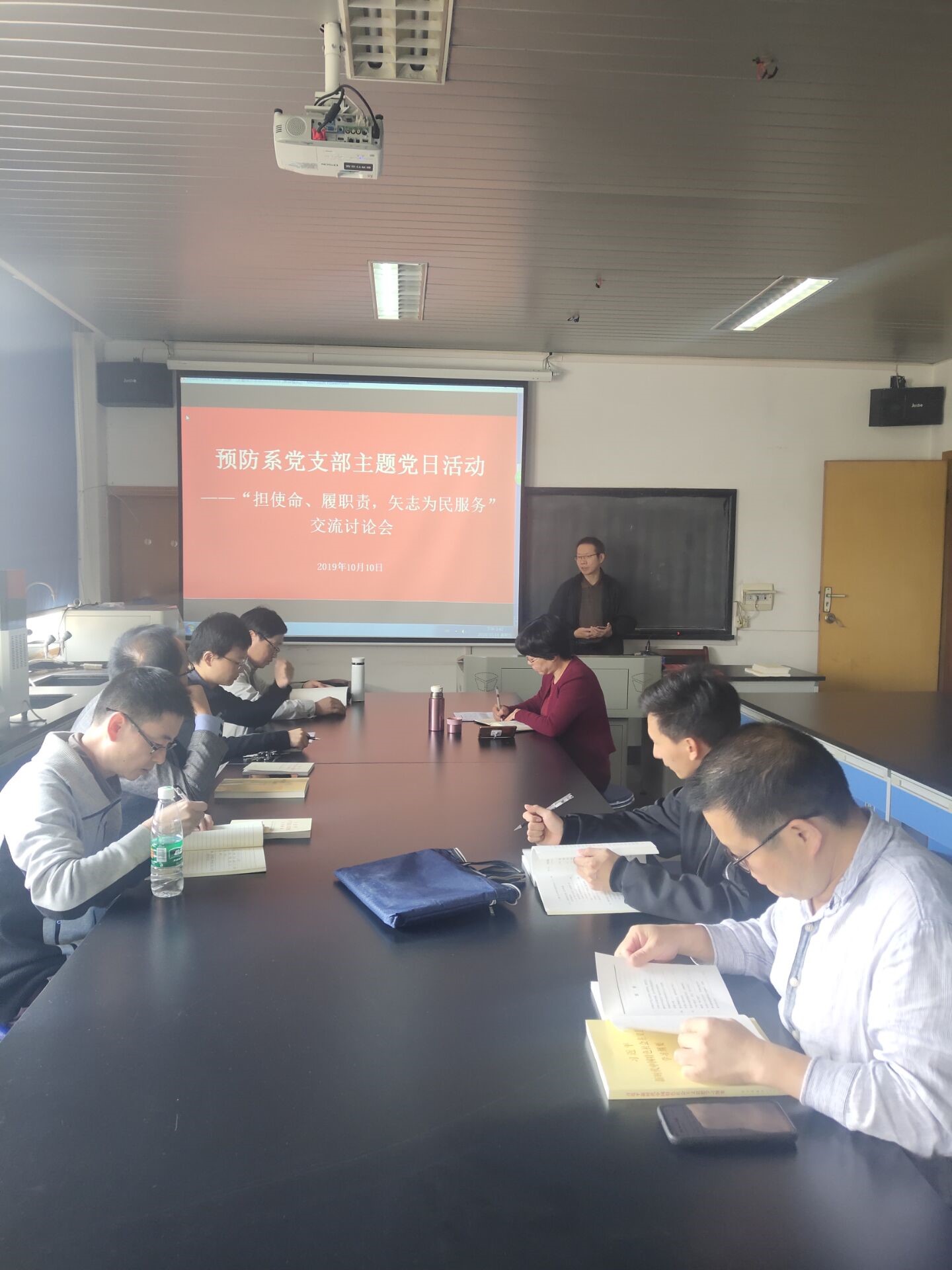 2019年10月18日,按照学院“不忘初心、牢记使命”主题教育工作安排,我院党委书记鄢朝晖及预防支部书记刘桃成分别为预防系党支部上专题党课,随后,预防系党支部开展“明初心,守初心,坚定理想信念”主题党日活动。会议由支部书记刘桃成主持,支部全体党员参加。
