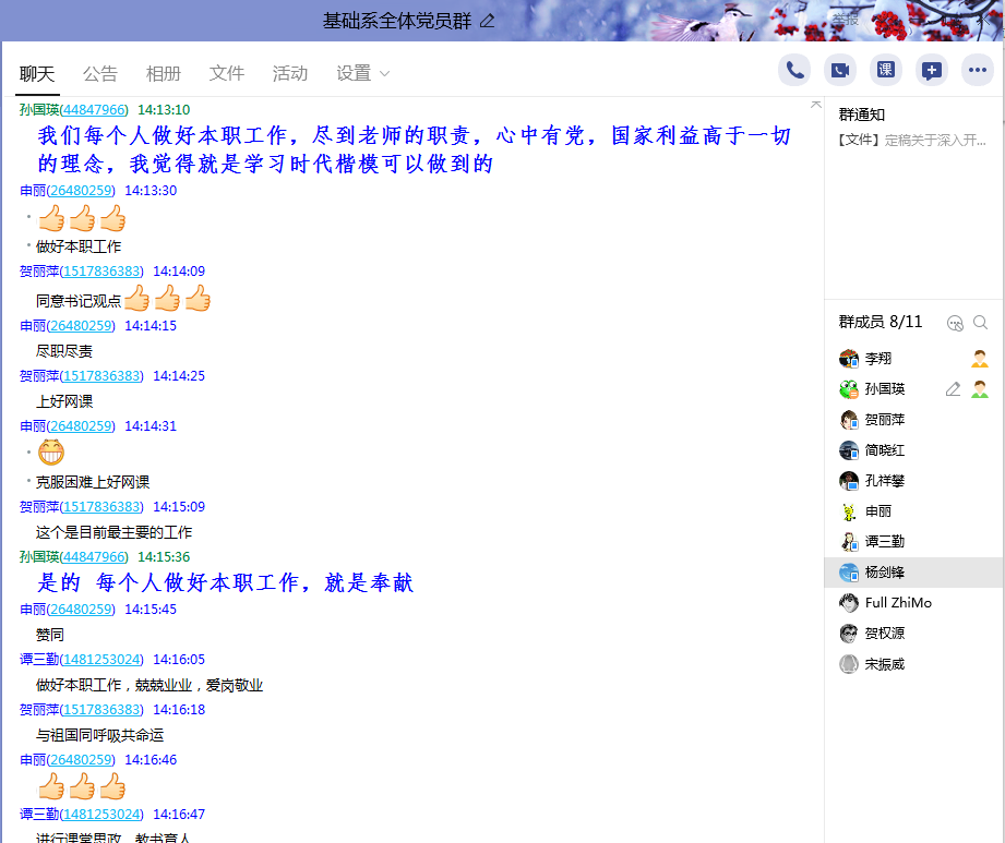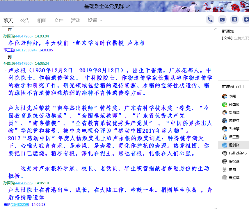 2020年3月19日下午两点,在抗击新冠肺炎疫情的特殊时期,基础医学系党支部在线开展主题党日活动——学习时代楷模卢永根同志优秀事迹讨论会,支部书记孙国瑛主持学习研讨会,支部全体党员在线参加学习与讨论。