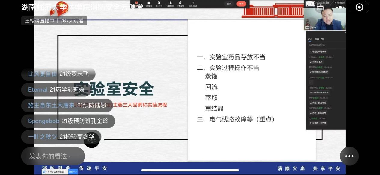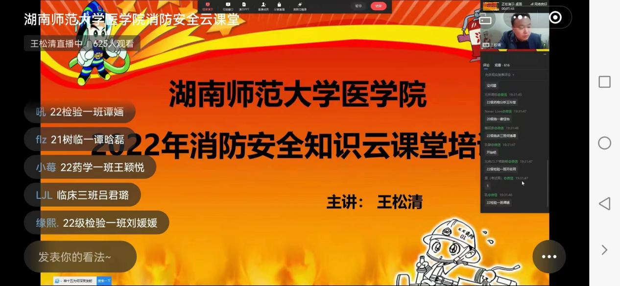 11月30日晚上,我院组织全体教职工与学生通过“云课堂”开展线上安全教育学习。此次培训,由湘安消防培训部主任王松清教官主讲。