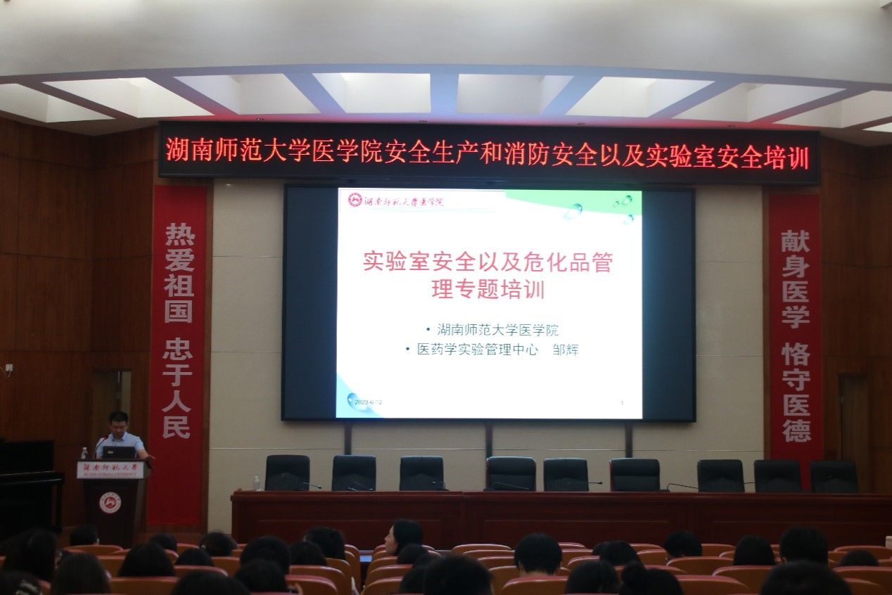 6月12日上午,我院于仁医楼学术报告厅举行实验室安全以及危化品管理专题培训。培训由我院医药学实验管理中心主任邹辉主讲,副院长邓文艳出席会议,全体实验室工作人员、研究生和部分本科生参加会议。