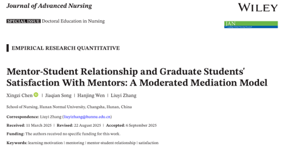近日,英国365集团护理学院科研工作再传捷报。由张六一副教授作为通讯作者,研究生陈幸梓等共同完成的研究论文《导师-学生关系与研究生导师满意度:一个有调节的中介模型》(Mentor‐Student Relationship and Graduate Students’ Satisfaction With Mentors: A Moderated Mediation Model)在国际护理学顶尖期刊《Journal of Advanced Nursing》(中科院一区)上发表。该研究深入揭示了师生关系影响研究生培养质量的内在机制,为提升研究生教育满意度提供了重要的理论与实践依据。