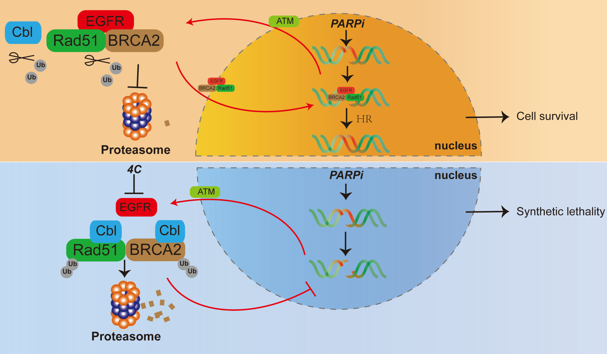 该团队长期致力于双胍类小分子的抗肿瘤功能及机制研究,基于前期提出的中间体衍生化理念及设计的具有自主知识产权的新型双胍衍生物4C优越的抗肿瘤活性,本研究进一步发现4C可靶向EGFR,增强BRCA2/Rad51与c-Cbl之间的相互作用,进而诱导这两种同源重组修复关键蛋白发生泛素化降解。该机制有效抑制BRCA1/2野生型卵巢癌细胞中的同源重组修复功能,将原本不敏感的癌细胞转化为对PARP抑制剂敏感的状态,形成“合成致死”效应,为突破PARP抑制剂的临床应用局限提供了全新思路。
