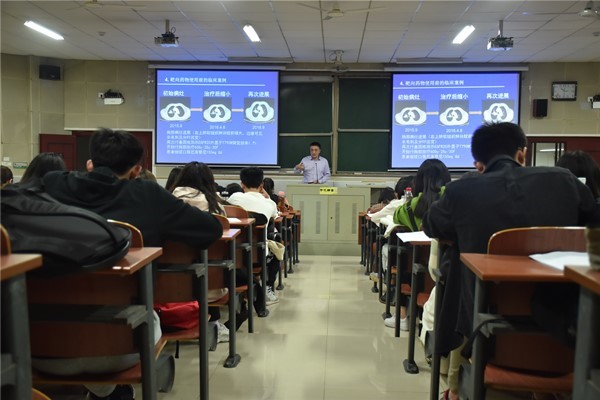 杨小平教授首先为大家讲述了药物创制发展历史,通过对不同时期临床试验的数据进行对比进一步讲述了药物创制的过程。接着他介绍了靶向药物的基本概念与研发状态,通过阐述理论与结合实际的方式讲解了靶向药物的基本概念,同时为大家展示了当今已经取得的相关的科研成果,并指出当今研发过程中任然存在的问题,为同学提供了可借鉴的研究方向。在介绍完靶向药物的基本概念及研发现状后,杨小平教授对靶向药物使用前的临床诊断与临床案例进行了分析。并举出靶向药物在当今医学治疗已有广泛应用,特别是在癌症抗肿瘤方面有了新的突破,这使得疾病的分析与治疗变得更加迅速有效。