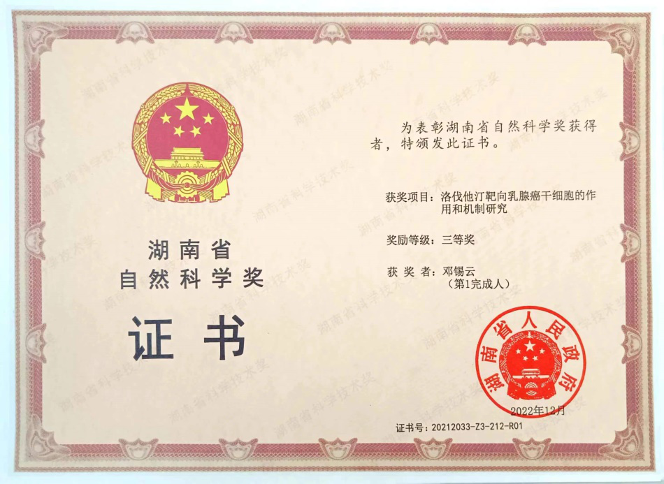 获奖名称:洛伐他汀靶向乳腺癌干细胞的作用和机制研究