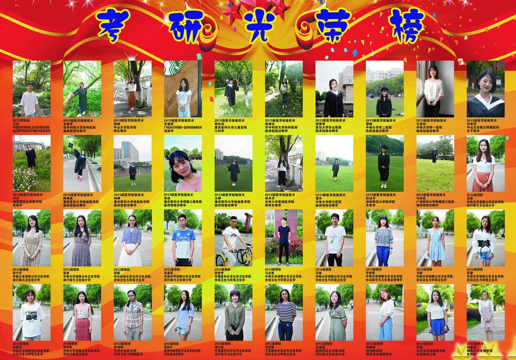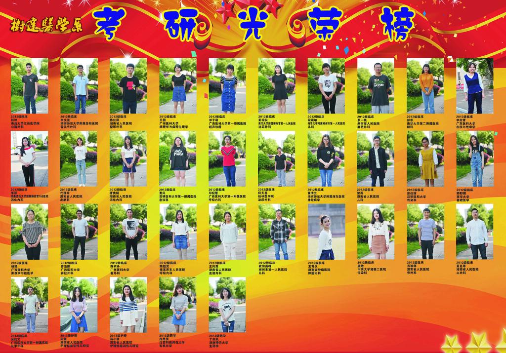 近年来,医学院不断强化学风、班风的建设,促使我院考研成绩屡创佳绩,录取质量大幅上升,今年,共有 114 人被985或211院校录取,涵盖了北京协和医学院、中国医学科学院、中山大学、浙江大学、四川大学、中南大学、复旦大学、华中科技大学、南京大学、西安交通大学、中国医科大学、吉林大学等知名院校。