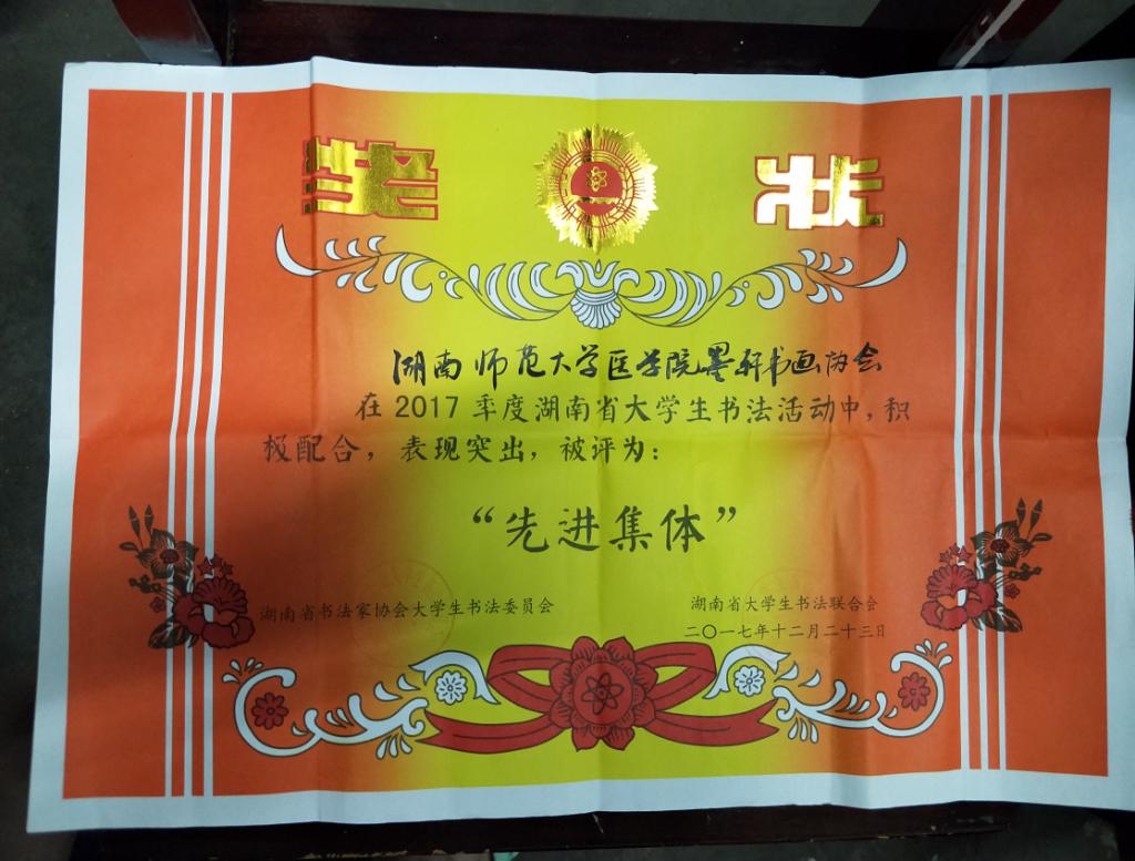 4.墨轩书法协会于2017年度湖南省大学生书法活动中荣获“先进集体”称号。