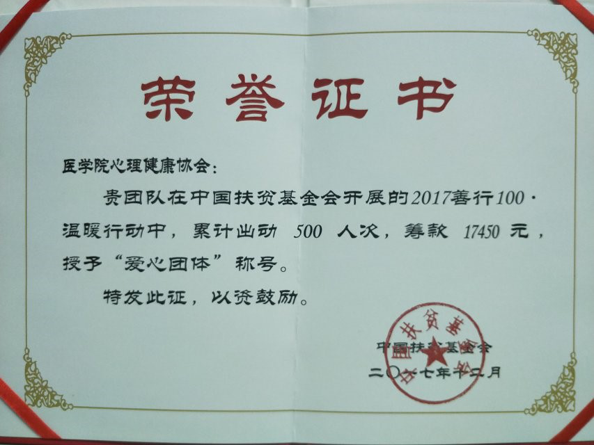 3.心理健康协会于2017年善行100•温暖行动中荣获“爱心团体”称号。