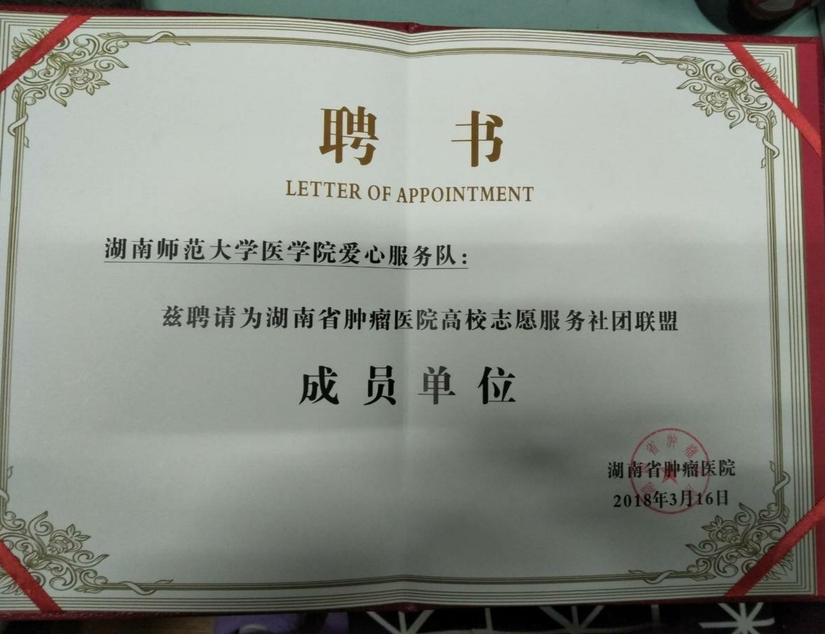 4.青年志愿者工作部获2018年3月年受学院附属省肿瘤医院颁发聘书(省级)