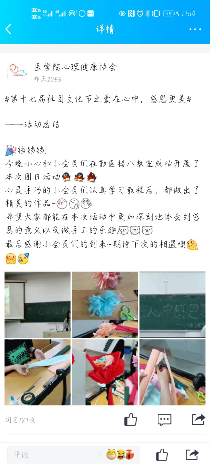 为让我院学生了解母亲节的来历,丰富情感世界,培养感恩意识,增强社会责任感,塑造健全人格。我院学生社团管理服务中心心理健康协会于5月14日在在勤医楼八教室举办了“感恩更美,爱在心中”的团日活动。