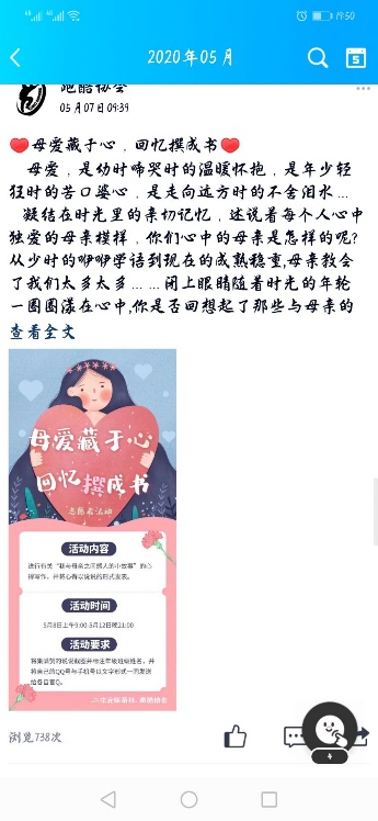 此次活动,进行有关“我与母亲之间感人的小故事”的心得写作,并将作品以说说的形式发表,在活动时间截止后,主办方通过投稿选出优秀作品进行公示。因活动恰逢母亲节,参加活动的作品也可以算是送给母亲的母亲节祝福与礼物。活动一开启就收到热烈的反响,有不少参加活动人员反映自己在发表小故事后也收到了来自自己母亲的回信。