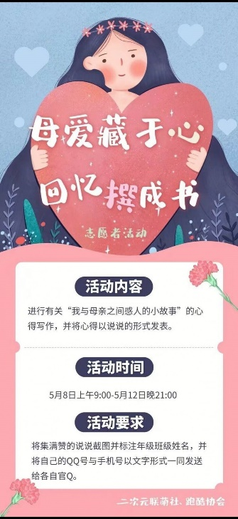 母爱是幼时啼哭时温暖怀抱,是年少轻狂时的苦口婆心,是走向远方时的不舍泪水。母亲节来临前夕,为宣扬“百善孝为先”的传统美德,激起感恩母亲的思绪,我院学生社团管理服务中心跑酷协会与二次元联萌社于5月8日—12日联合举办“母爱藏于心,回忆撰成书”主题活动。
