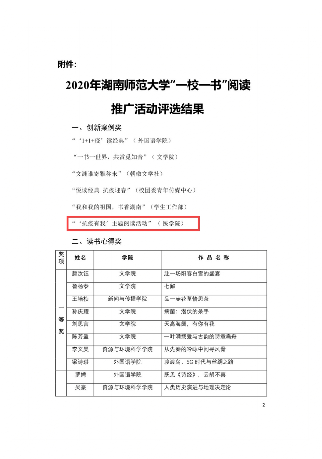 在此次评选中,我院组织的“‘抗疫有我’主题阅读活动”获得创新案例奖。我院学子积极参与“抗疫有我”主题阅读活动,其中,王千跃的作品《无无邪之美 悲悯之意 惊奇之心》获得读书心得二等奖,向琴瑶的作品《诗三百,思无邪》和徐金帆的作品《愿我们在夹缝中生生不息》获得读书心得三等奖。