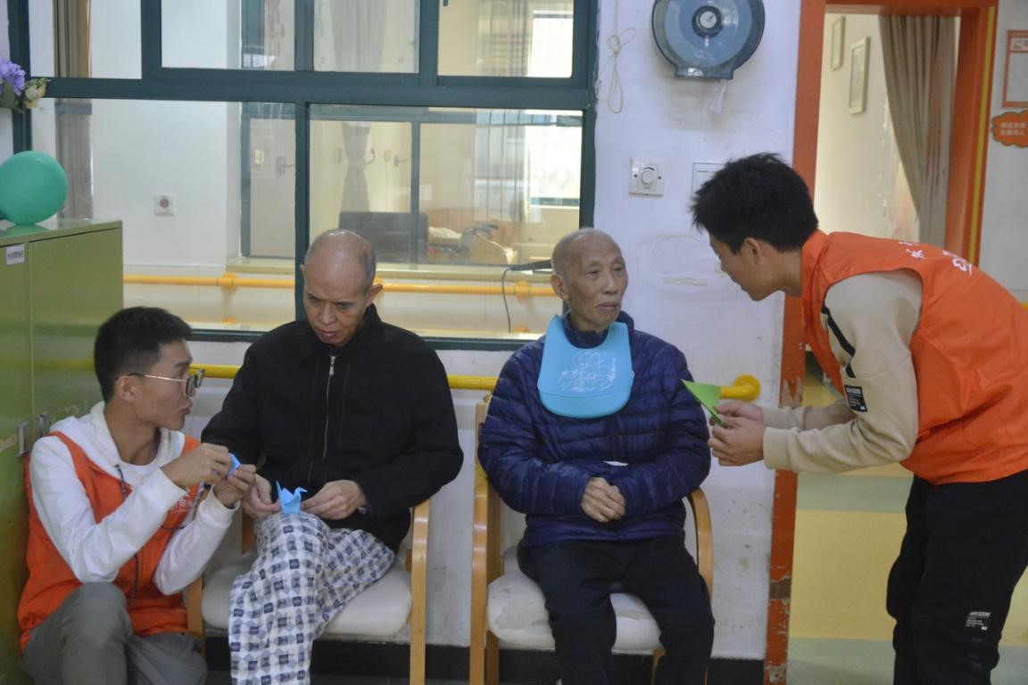 到达敬老院后,志愿者们统一服装,在敬老院负责人的引导下进入室内。志愿者们从老人们喜好出发,准备了多样化的节目,如歌曲合唱《我和我的祖国》、《祖国,今天是你的生日》、手语舞《国家》等。志愿者们按照节目安排顺序依次上台表演节目,场上的志愿者认真表演,带动现场氛围;未上场的志愿者们陪伴在老人身旁。受到志愿者们表演的影响,现场的一位老奶奶也向志愿者们唱起了歌。在表演结束后,志愿者们手把手教老人折千纸鹤、衣服等趣味折纸,让老人们共同参与到活动中,部分老人因身体原因不能参与活动,志愿者们便单独与老人沟通交流,老人还和志愿者们谈起了自己的往事,分享生活经验,在相互交流中志愿者们和老人越来越亲近,场面十分温馨。