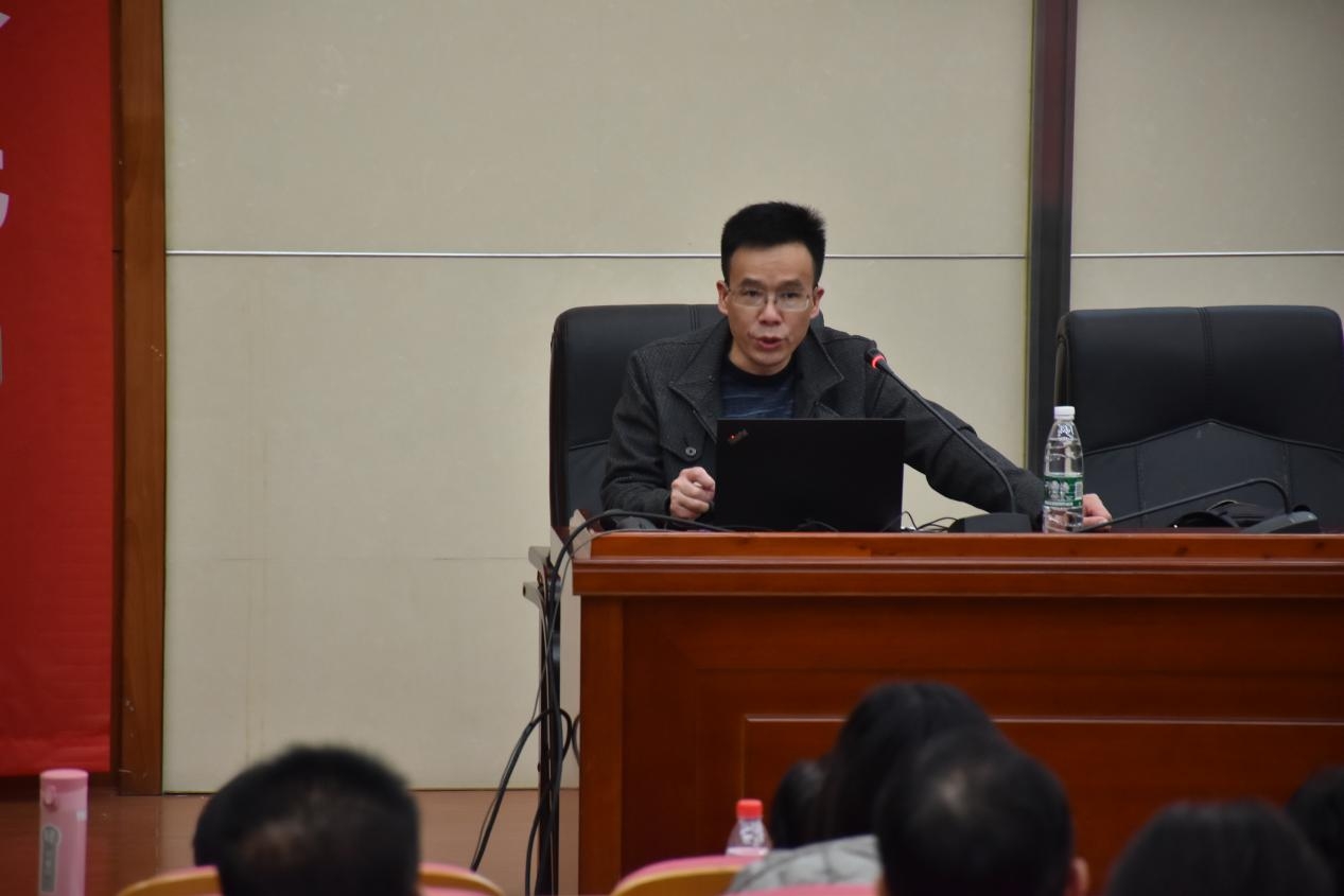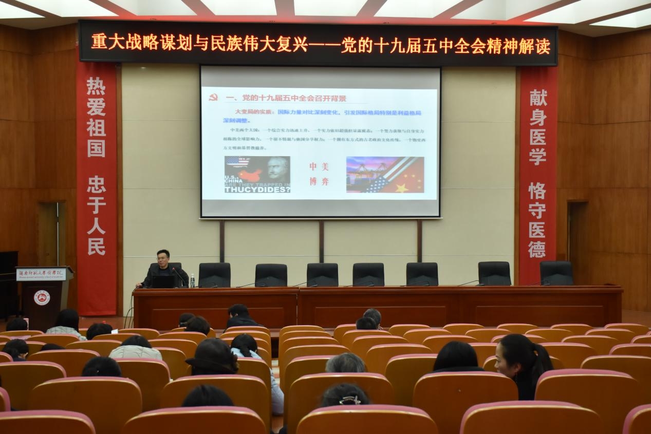 为深入学习宣传贯彻习近平新时代中国特色社会主义思想,全面准确把握十九届五中全会精神,2020年12月10日下午,我院在仁医楼学术报告厅举行全体教职员工政治学习,邀请校党委讲师团陈德祥教授进行题为《重大战略谋划与民族伟大复兴——党的十九届五中全会精神解读》的报告,党委书记鄢朝晖主持报告会。