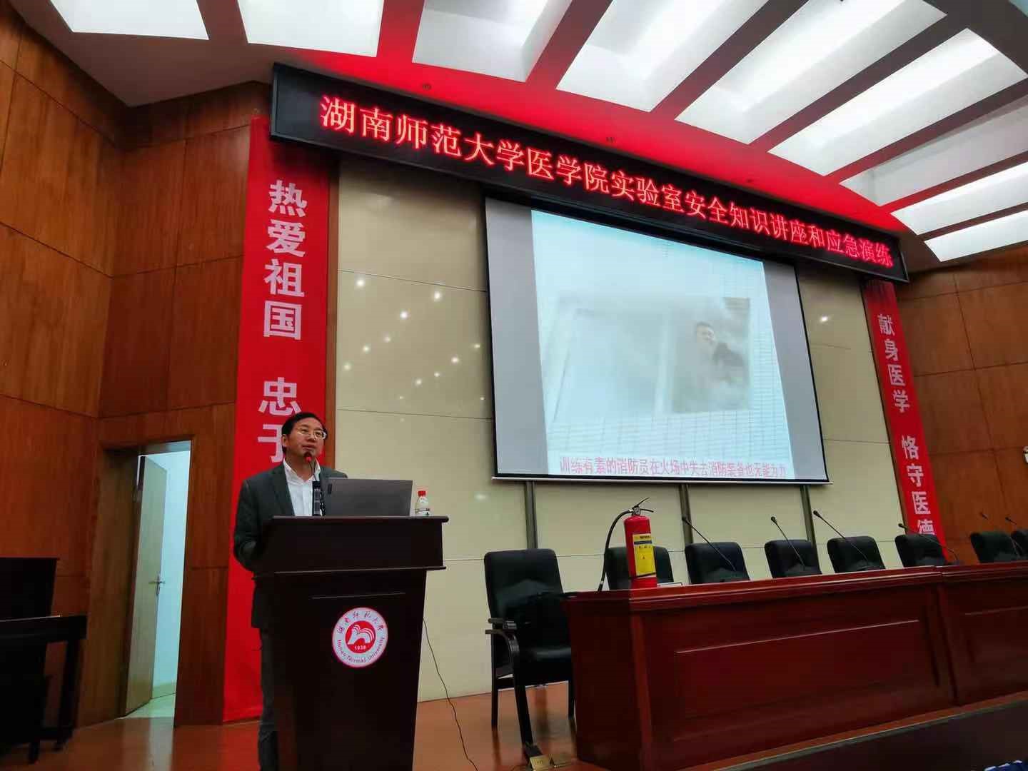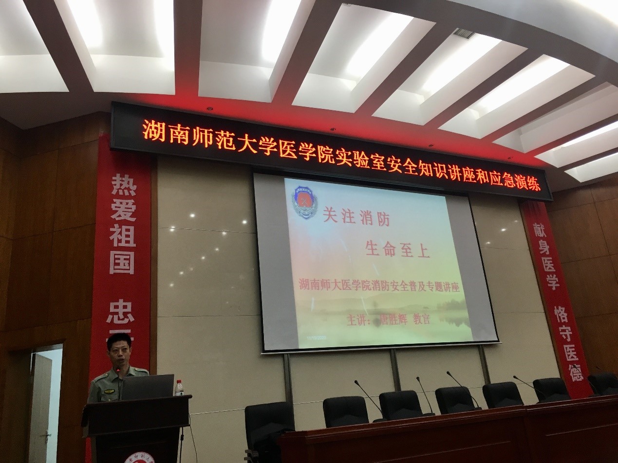 11月19日下午,我院于仁医楼学术报告厅举行消防安全知识讲座。此次活动由长沙市消防协会唐胜辉教官主讲,我院党委书记鄢朝晖主持,我院院长何祖平、副院长邓文艳及全体教职工、部分研究生及本科生参加此次活动。