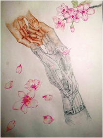 有颜色的手代表医务工作者(全国人民),黑白的手代表新冠患者(武汉),颜色代表生命和希望,黑白代表疾病和死亡,两手交接处黑白染上色彩,寓意援助:医务工作者对患者的援助、全国人民对武汉同胞的援助。周围的樱花开放指代武汉重回正常,同时樱花的花语是健康,代表对患者康复的祝福。