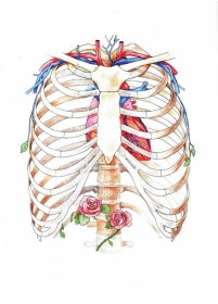 心是一个中空的肌性纤维性器官,胸部的骨架似牢笼一般保护着它。画面远处的肋骨和椎骨没有勾线,并且混入了浅浅蓝色,表现了近实远虚的效果,使画面更有层次感。本作品参考了《奈特图谱》以及《系统解剖学》教材,按照比例绘制,较为精准、专业。画面中的玫瑰除了增加艺术感,也有循环不止、生命不息的寓意。心虽然被困在骨架的牢笼中,仍然充满活力。