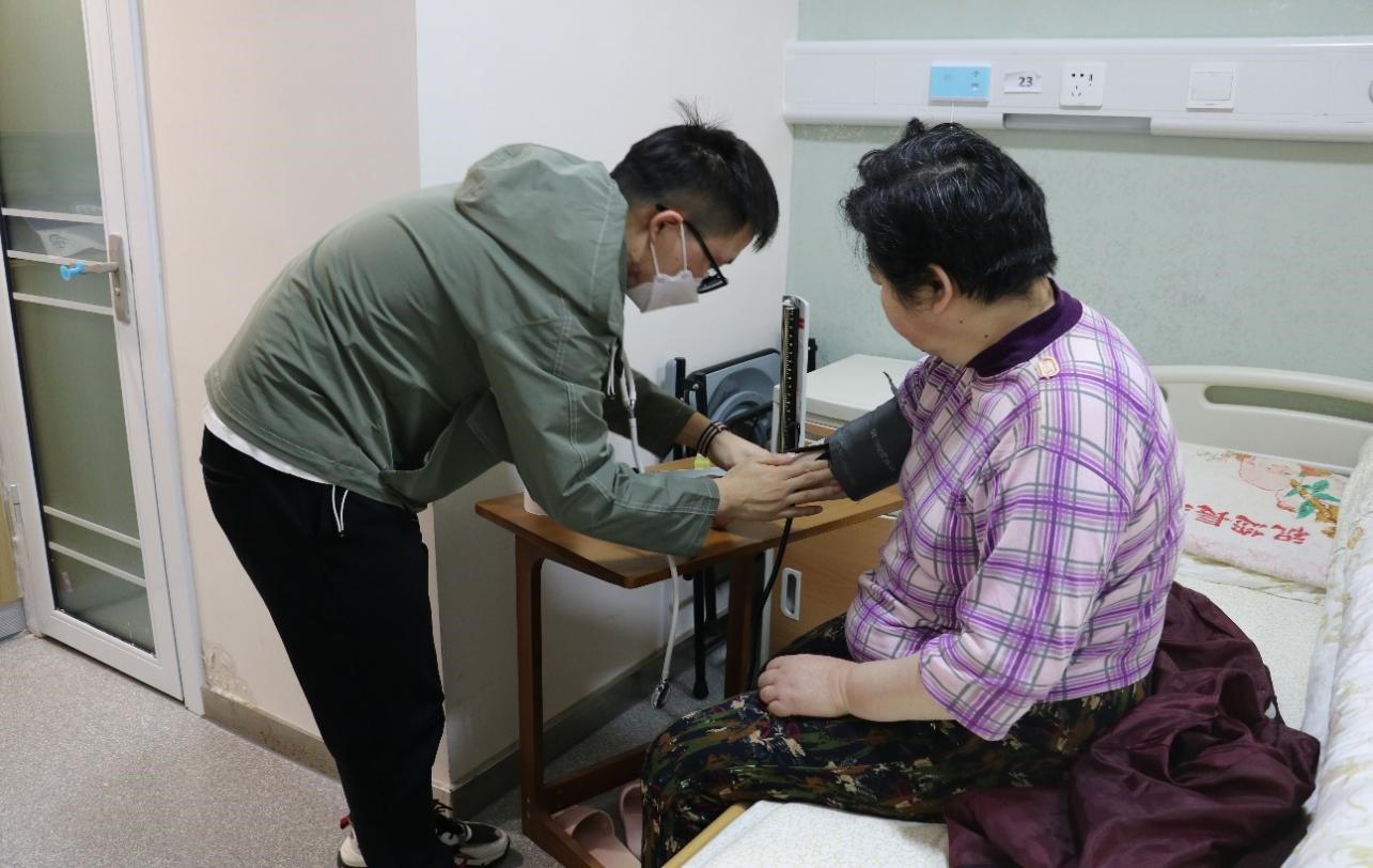 到达养老中心后,活动负责人聂徽与养老院的工作人员进行对接,引导志愿者进入室内。志愿者们首先在老年活动室与各位老人合照,接着便分成四组,分别到不同的楼层为老人测量血压和血糖。虽然养老院的老人们大多失语失智,但是志愿者们依然积极地为老人们测量。测量结束后,志愿者们一一向老人汇报了测量结果。老人们听完后,对志愿者表示感激。