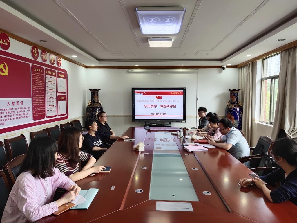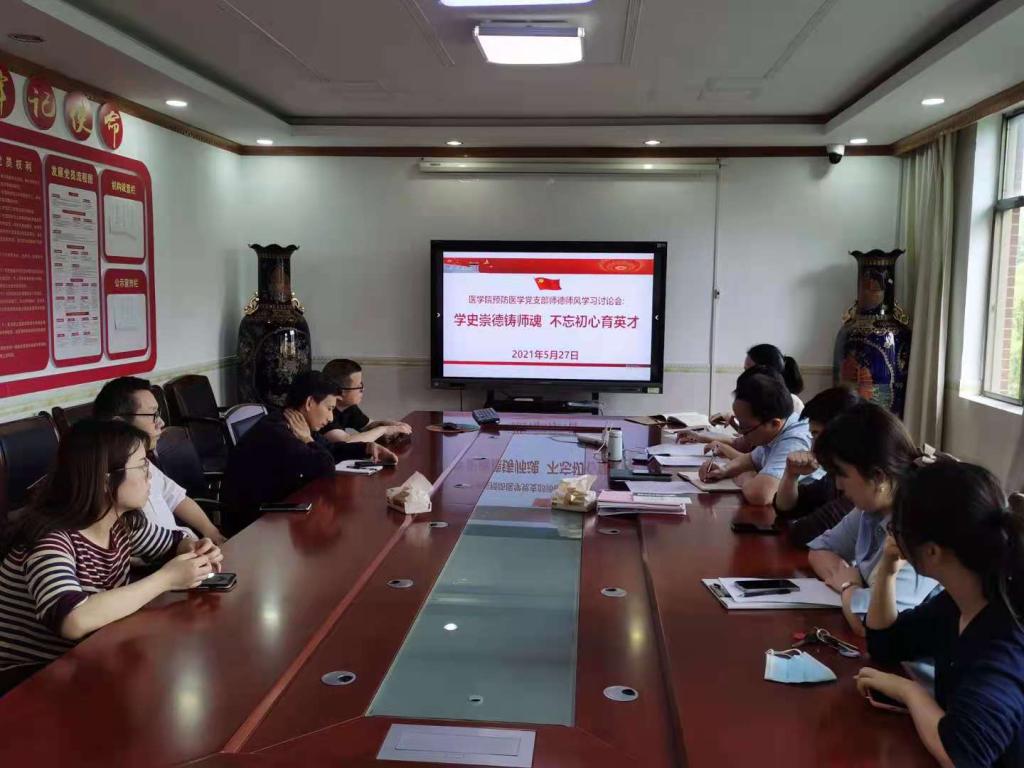 2021年5月27日,预防医学党支部在办公楼四楼会议室召开党史学习教育“学史崇德”专题研讨会和“学史崇德铸师魂 不忘初心育英才”师德师风学习讨论会。会议由支部书记陈适主持,院党委书记做为普通党员参加参加本次研讨会。