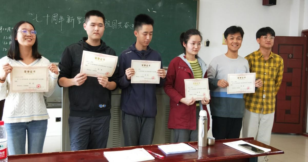 活动结束后,班级团支书和获奖同学合影留念。此次活动的举行,不仅让同学们回顾了新中国七十年发展的辉煌历史,也了解到了曾经峥嵘岁月的困难与艰辛。同时也让同学们深知,处在平和安乐的美好时代,更应该牢记历史使命,肩负实现中华民族伟大复兴的神圣使命,不断提升自我能力,健全人格,为社会进步奉献出自己的一份力量。
