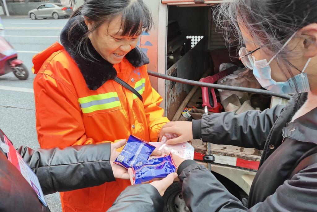 志愿者们向他们说明来意后,他们纷纷停下了手中的工作,腾出手接受了志愿者们送去的暖宝宝以及小零食,并对志愿者们表示了感谢。