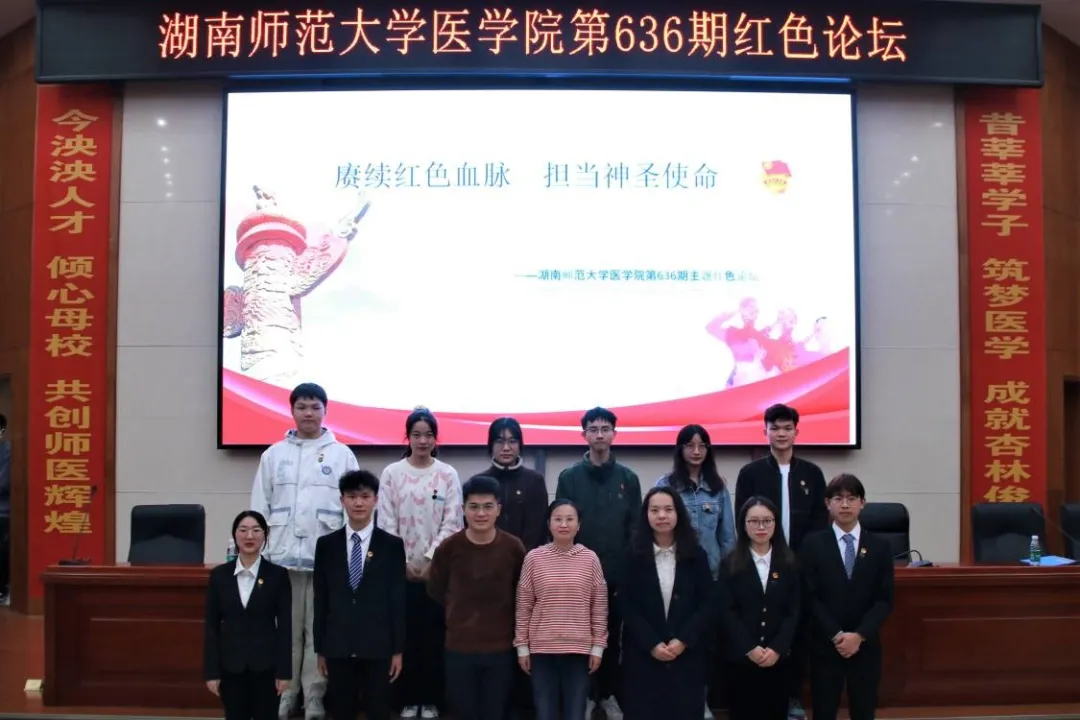 11月26日晚,我院团委宣传部于学术报告厅举行以“赓续红色血脉,担当神圣使命”为主题的红色论坛主讲会。预防系老师阳益德老师、预防系老师秦露露老师、院团委书记张明明老师、院团委学生副书记童海、院学生会主席团邓云帆、院团委学生副书记兼学生社团管理服务中心主任蒋秀金、院团委学生副书记兼青年传媒中心主任唐蓓、院学生会主席团郭小勇、院学生会主席团刘宇菲、校团委宣传部、各兄弟学院和部分医学院的同学参加此次论坛。