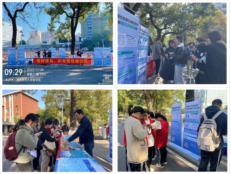 11月28日-29日,篮球场前坪树立起破伤风预防科普展板,医学志愿者结合实际案例,为学生现场讲解破伤风预防的常见误区。对于大学生而言,体育课、实验课、运动会等均会增加外伤风险,因此破伤风疫苗的暴露前免疫不容忽视。志愿者们不仅对学生提出的问题给出了专业解答和预防建议,还将破伤风预防关键点做成科普问答,使学生在竞答娱乐的同时,加强记忆,掌握科学知识。活动期间,现场气氛轻松热烈,受到学生的广泛好评。